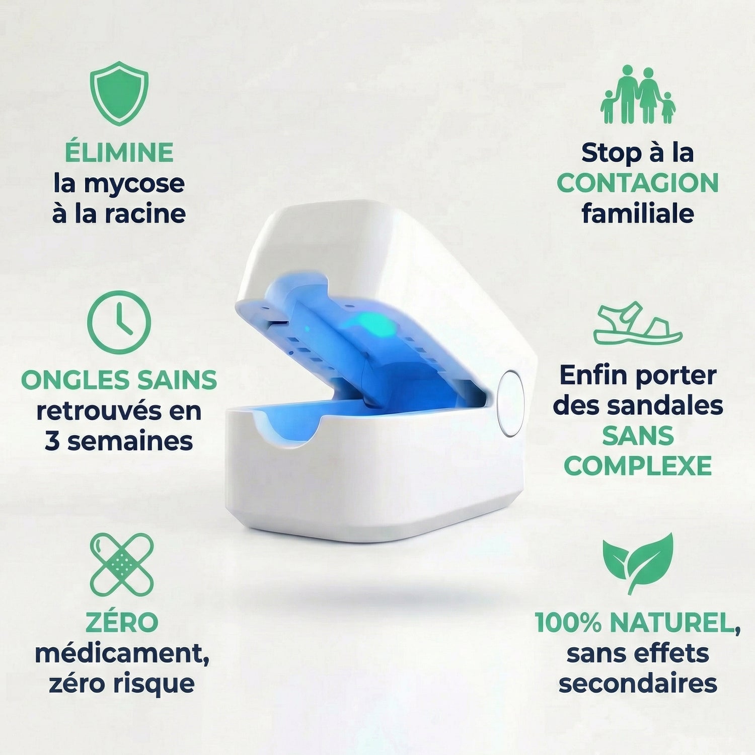 Notre technologie repose sur une lumière bleue douce, reconnue pour sesbienfaits en dermatologie.Elle agit en profondeur pour éliminer la mycose,sans aucun risquepour la peau ni pour l’ongle.