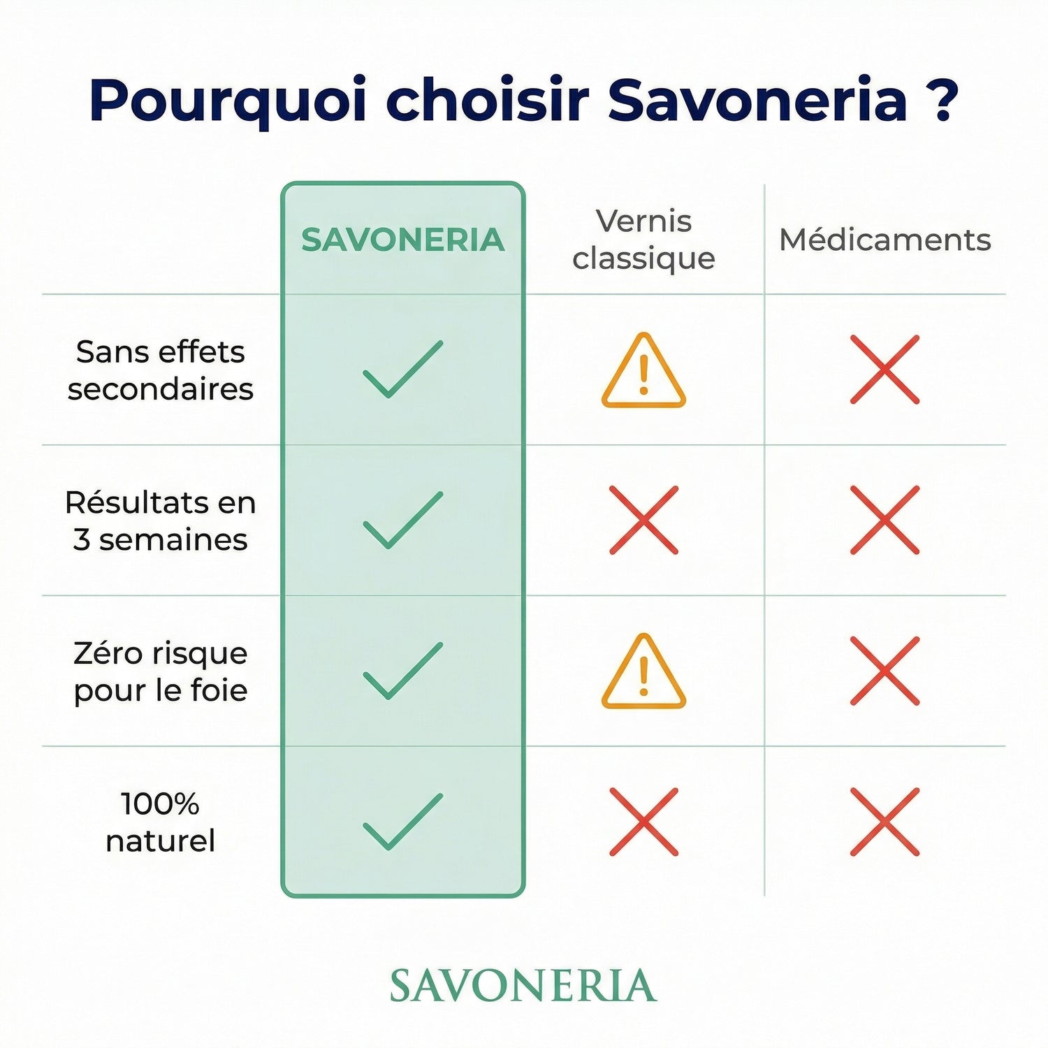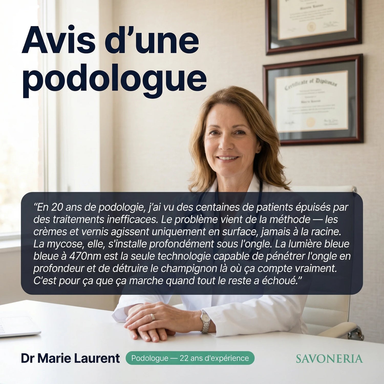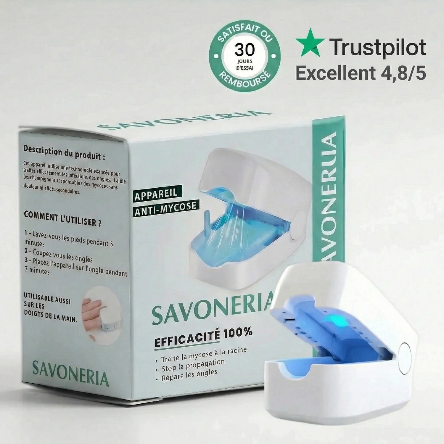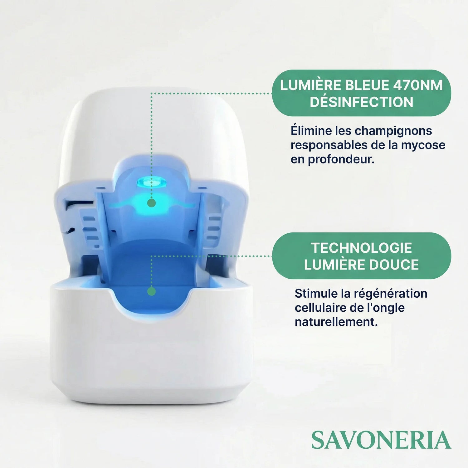 Savoneria agit différemment — la lumière bleue pénètre sous l'ongle là où les traitements classiques n'atteignent jamais.